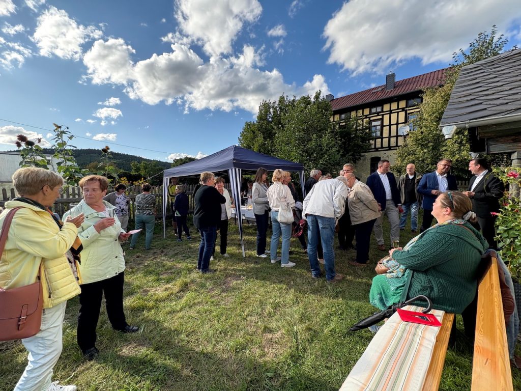 Die diesjährige Orgelfahrt von Frauenkirchenkantor Matthias Grünert durch den Saale-Orla-Kreis startete am Freitag im Pößnecker Ortsteil Schweinitz. Die Vorfreude auf die Tournee veranlasste die Gastgeber und Organisatoren zu einem kleinen Sektempfang im Kirchgarten. In lockerer Form konnte man mit dem in Nürnberg geborenen Protagonisten ins Gespräch kommen.